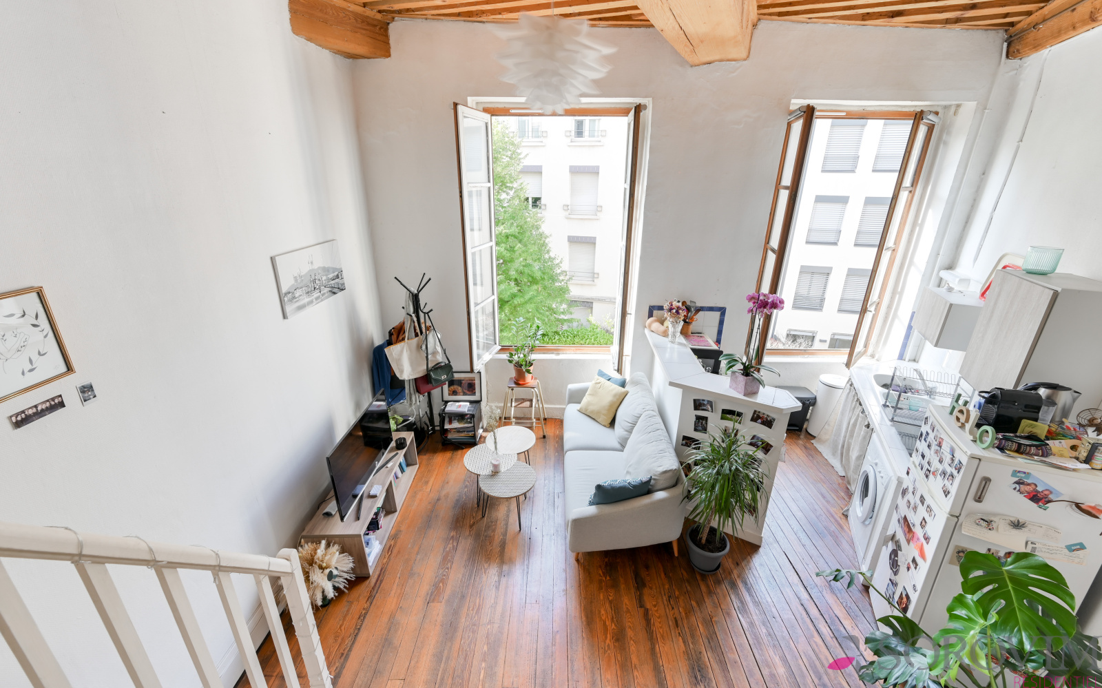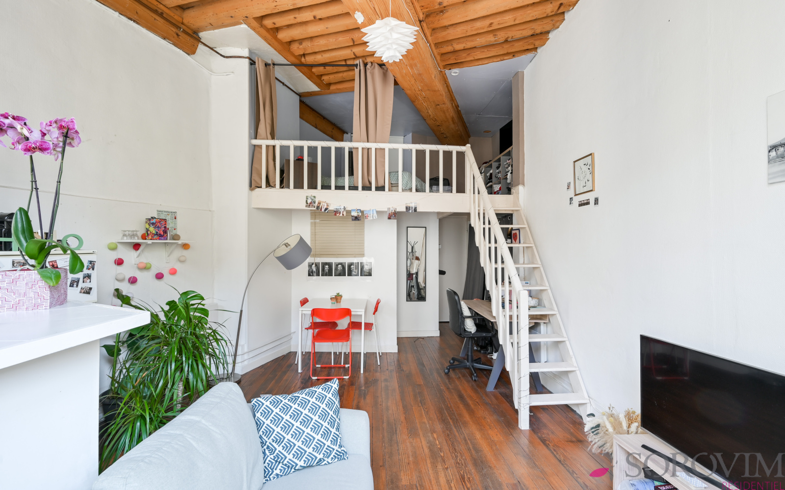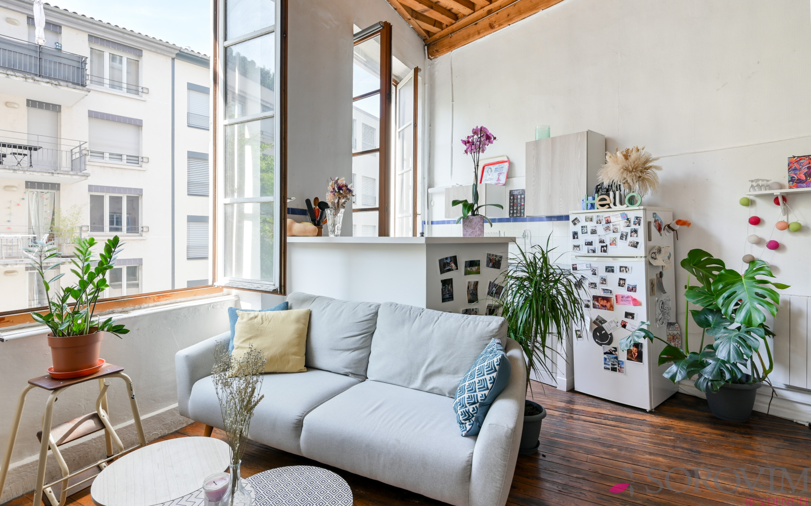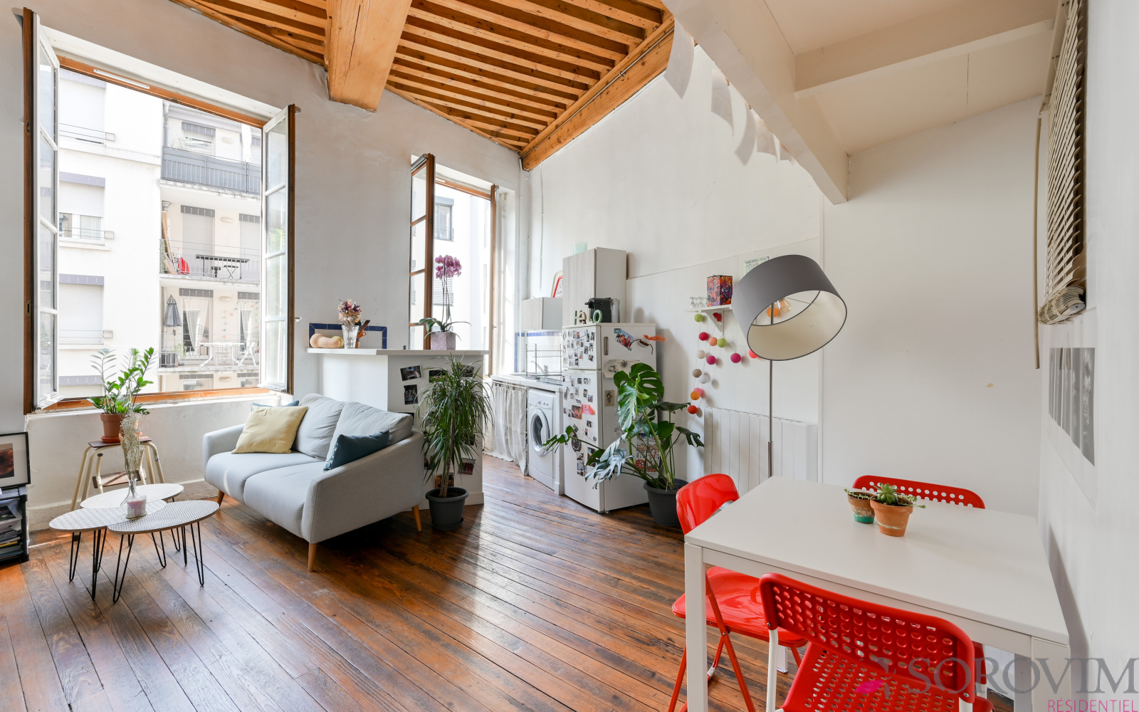 Idéal Investisseur. Secteur prisé proche de la grande rue de la Croix-Rousse, Théâtre et Hôpital, dans un immeuble ancien, vous serez séduit par ce studio de charme avec poutres apparentes, belles hauteur sous plafond et parquet bois d'une superficie de 34,60 m² habitable et 26 m² Carrez. Il est clair et lumineux. Il se compose d'une pièce de vie ouverte sur une kitchenette, une mezzanine de 8 m² offrant un coin couchage avec rangements. Une salle d'eau.