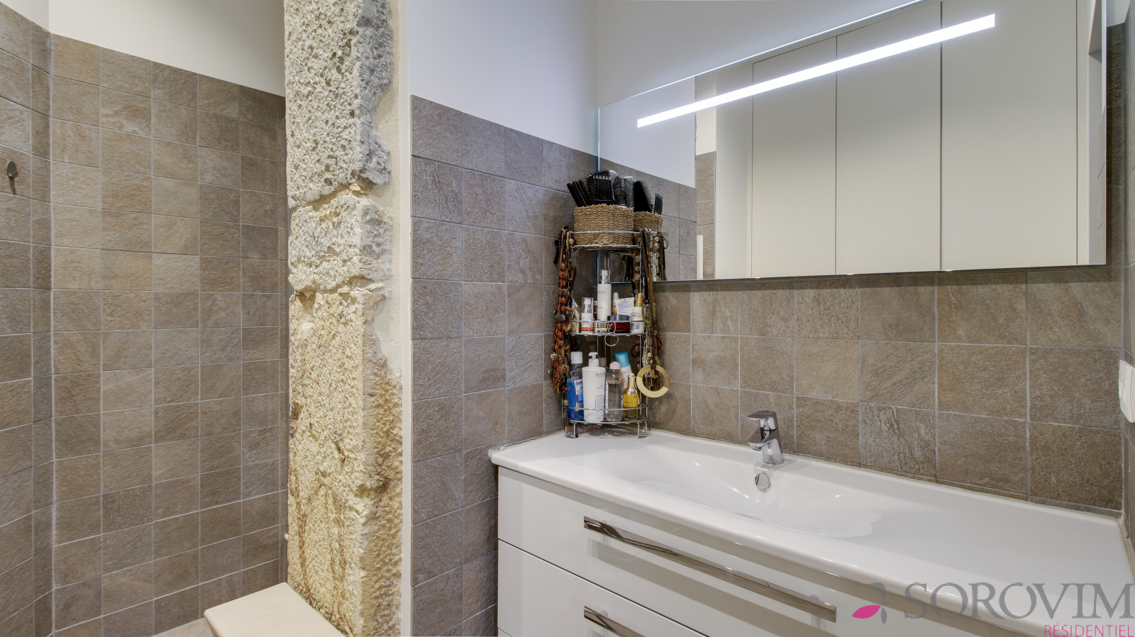 Côté cour, une cuisine contemporaine, une salle d'eau-buanderie et un toilette indépendant. Possibilité d'un parking en location.