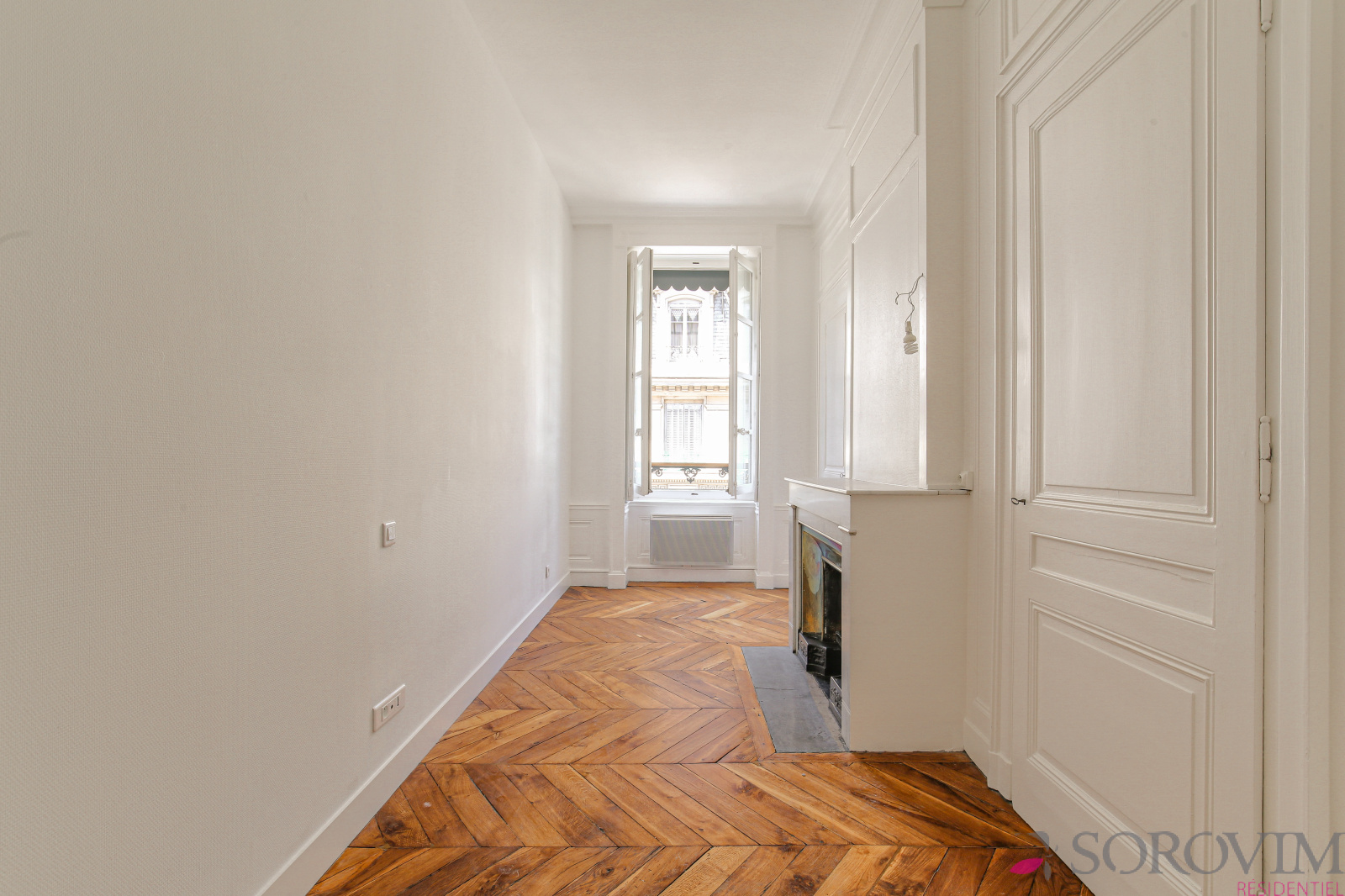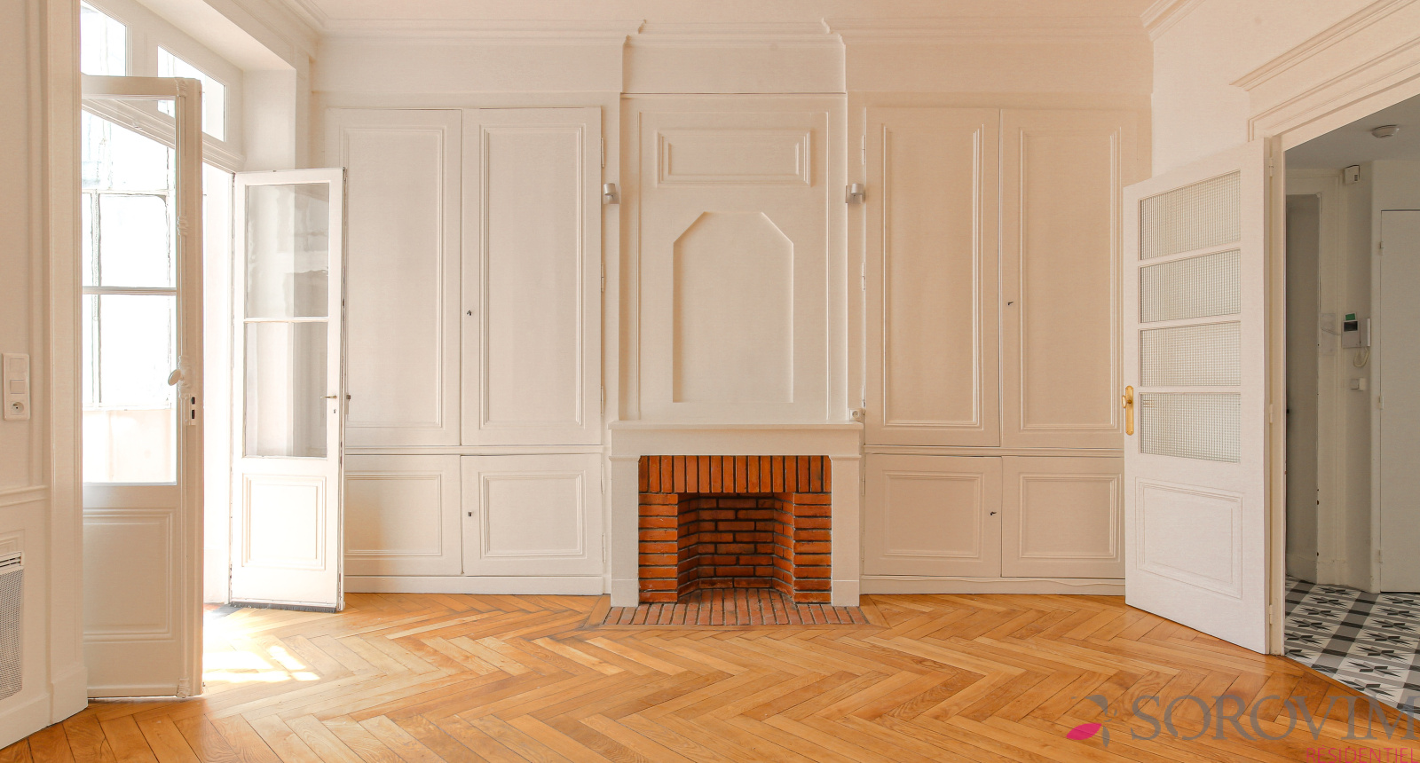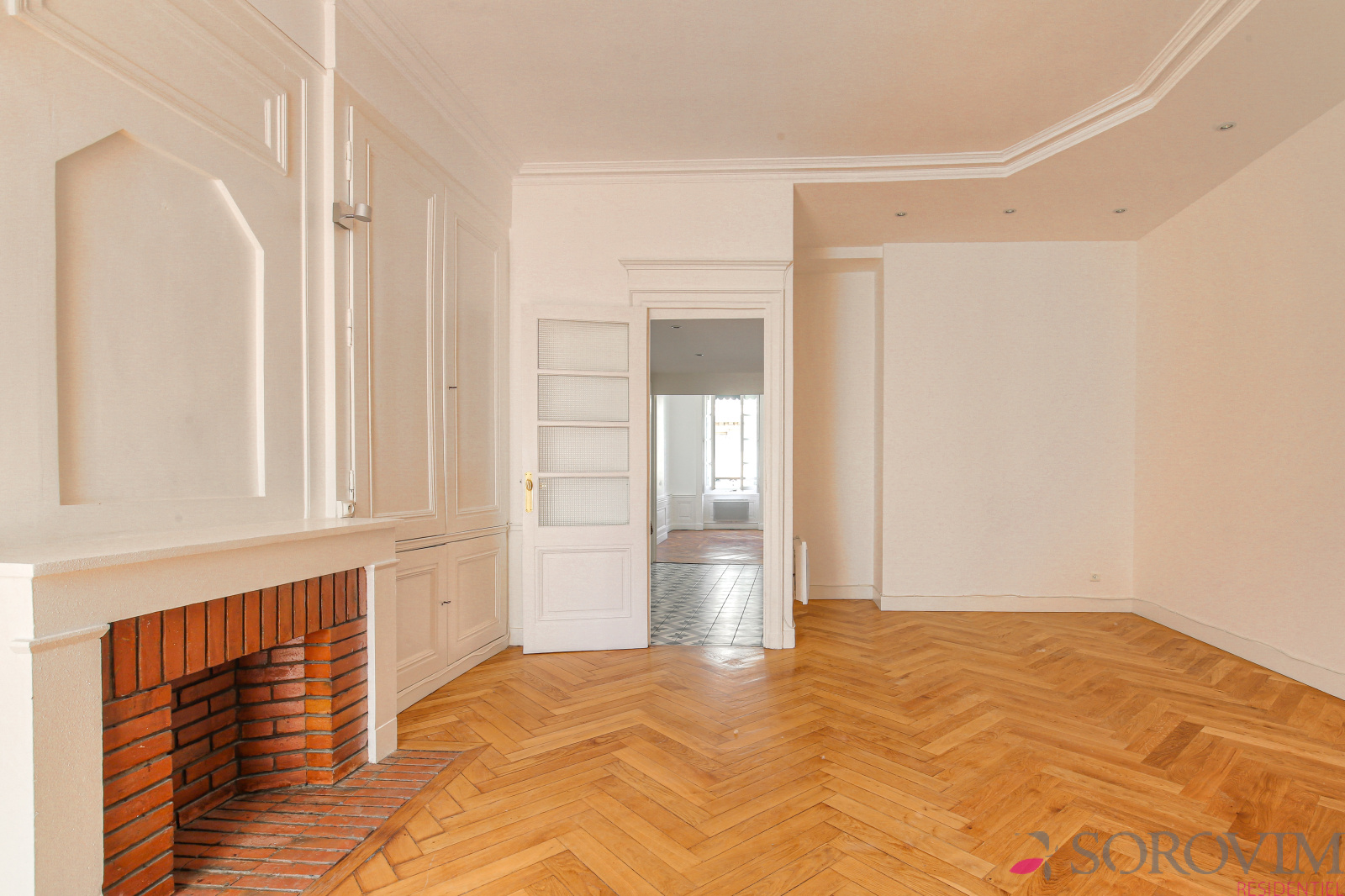 Lyon 6ème - Métro Foch. Dans un immeuble bourgeois, charmant 3 pièces de 87 m² ayant conservé son charme ancien avec parquet chevron, cheminées et hauteur sous plafond. Une spacieuse entrée dessert deux chambres en parquet dont l'une avec alcôve. Sur la cour intérieur, au calme, le séjour ouvre sur une loggia avec tomette ancienne et verrière. Une cuisine indépendante meublée et une salle de bains avec lumière naturelle. Chauffage individuel électrique.