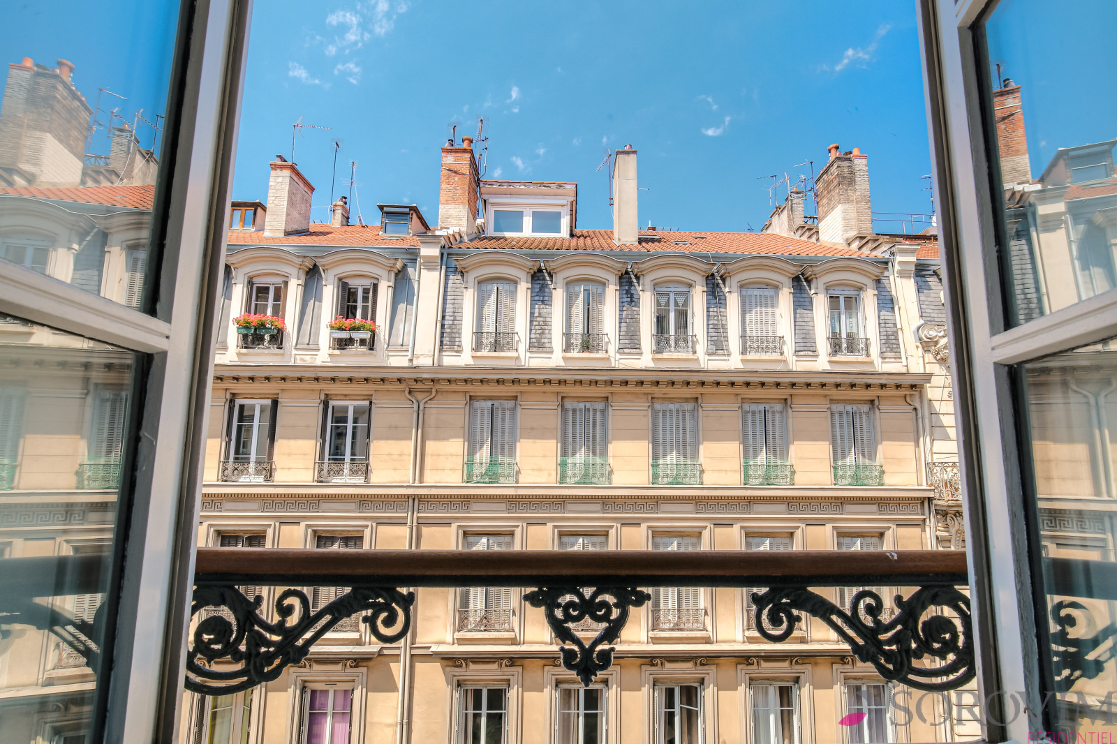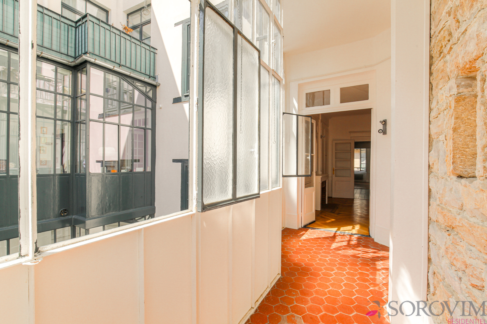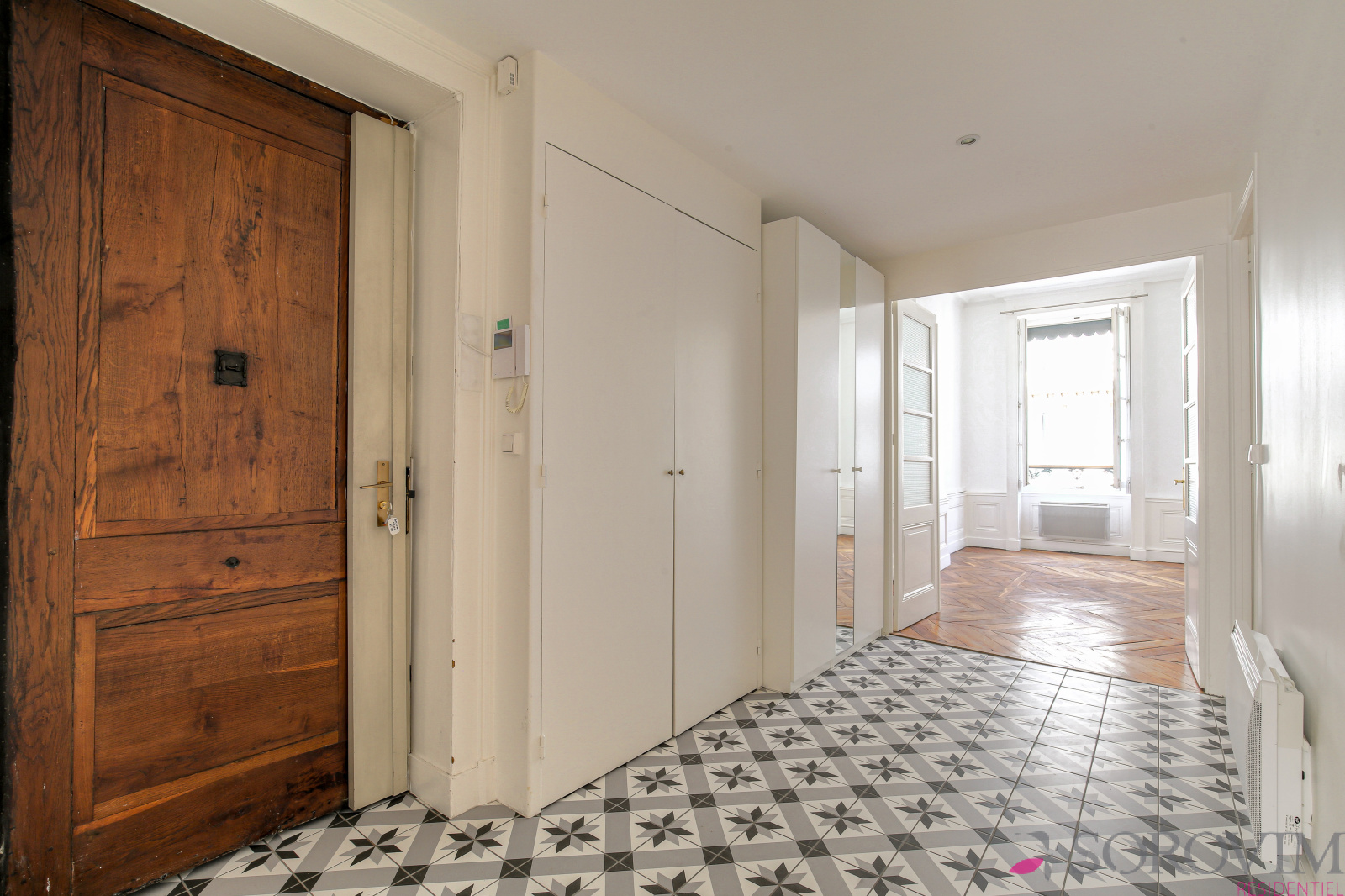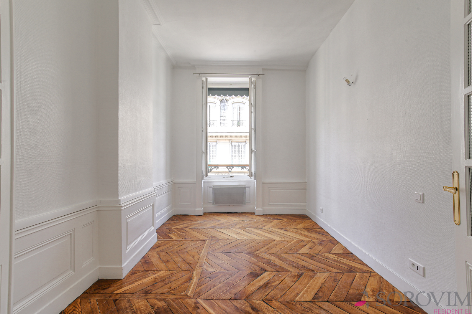 Lyon 6ème - Métro Foch. Dans un immeuble bourgeois, charmant 3 pièces de 87 m² ayant conservé son charme ancien avec parquet chevron, cheminées et hauteur sous plafond. Une spacieuse entrée dessert deux chambres en parquet dont l'une avec alcôve. Sur la cour intérieur, au calme, le séjour ouvre sur une loggia avec tomette ancienne et verrière. Une cuisine indépendante meublée et une salle de bains avec lumière naturelle. Chauffage individuel électrique.