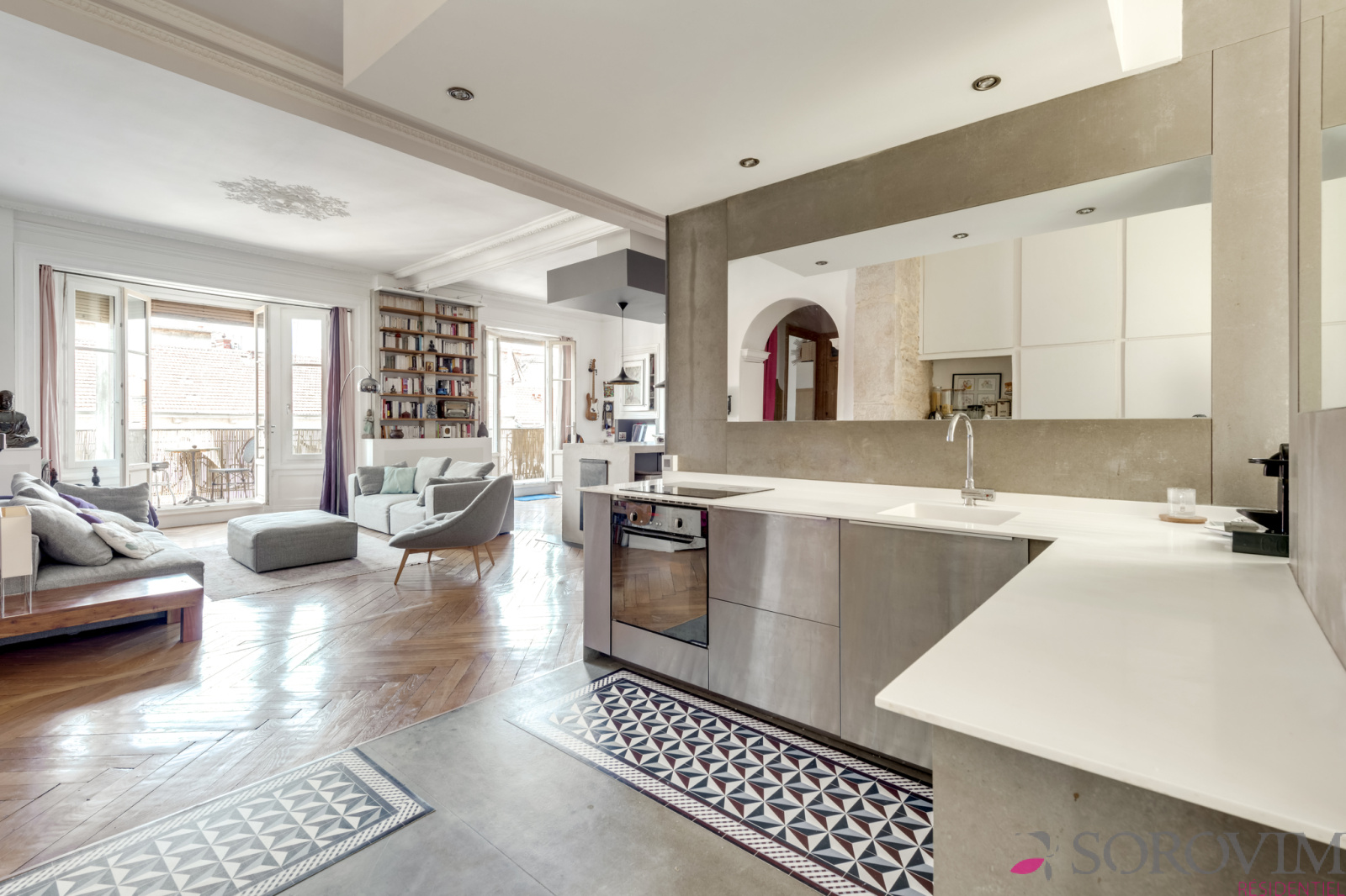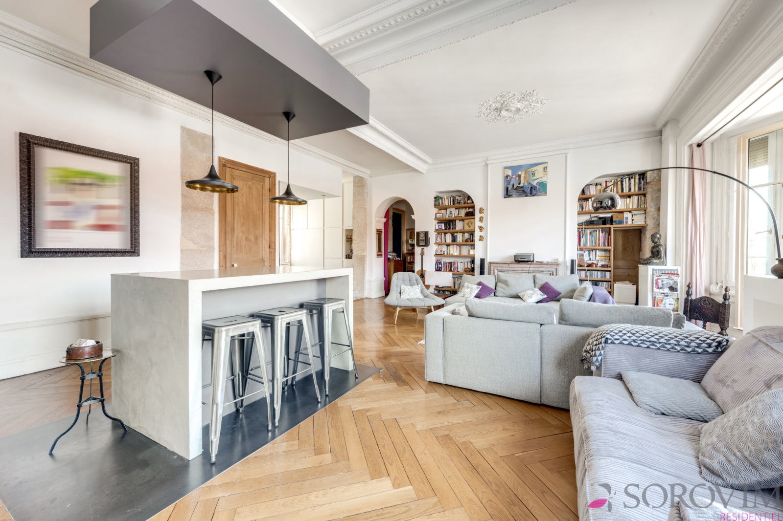 Dans un bel immeuble bourgeois, en étage élevé avec un ascenseur, charmant appartement de 101 m² avec une vue dégagée. Un séjour et une salle à manger de 50 m² donnant sur un balcon filant, une cuisine meublée et équipée de bonne dimension. Le dégagement dessert deux chambres en parquet et une salle d'eau. Le charme de l'ancien a été conservé avec une hauteur sous plafond de 3,80 m, de belles cheminées et un parquet chevron d'époque. Rafraîchissement à prévoir. Cave et Grenier.