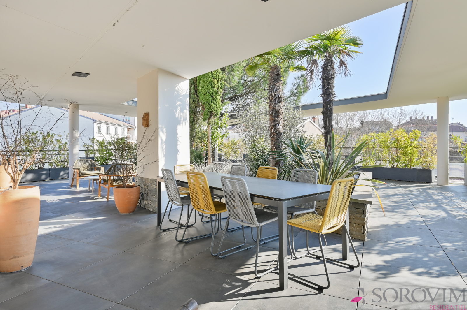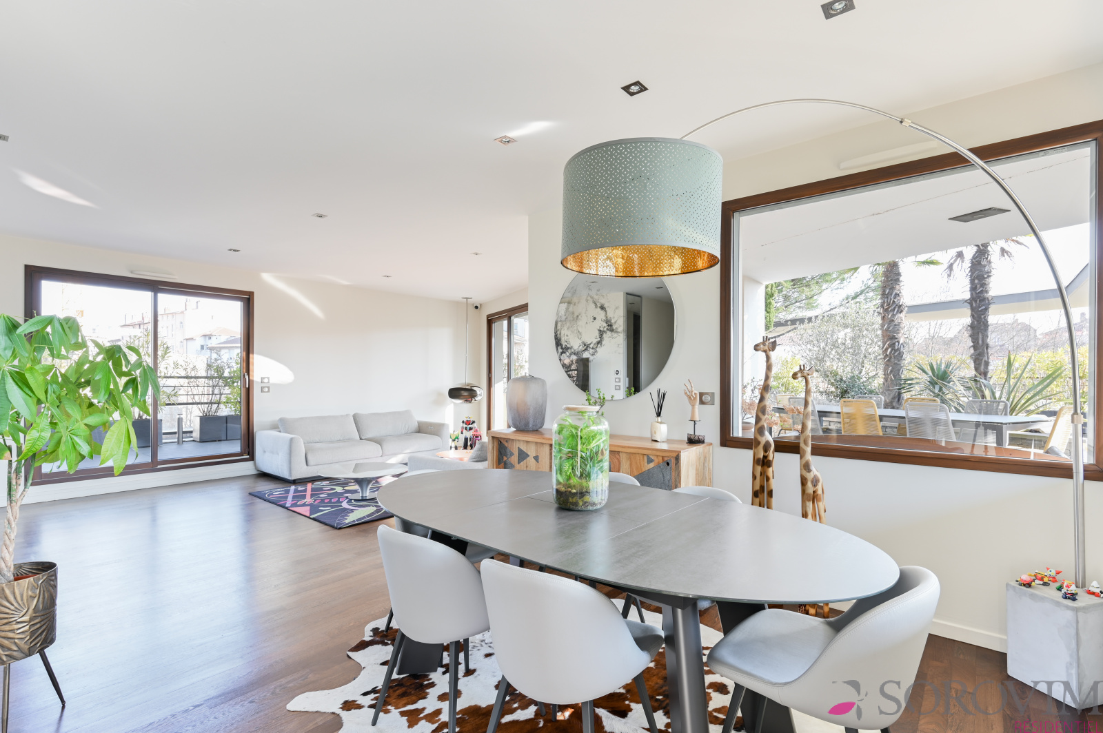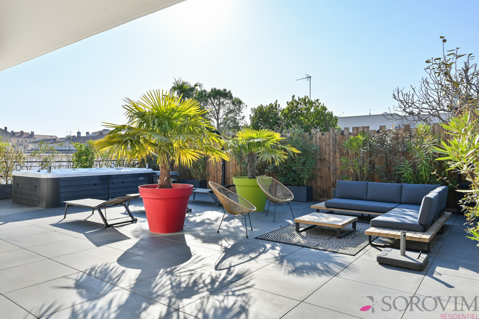 Lyon 4ème / Croix-Rousse. Exceptionnel - maison sur le toit avec une magnifique terrasse paysagée de 393 m². Véritable toit terrasse pour cet appartement au dernier étage d'une résidence de standing. Baigné de lumière avec ses nombreuses ouvertures et climatisé, il se compose d'une belle pièce de vie en parquet ainsi qu'une cuisine équipée s'intégrant parfaitement à cet espace de vie chaleureux. La partie nuit offre trois chambres et deux salles d'eau élégantes. L'ensemble ouvrant sur cette terrasse arborée avec ses aménagements réalisés sur-mesure, son solarium avec un grand jacuzzi et douche.