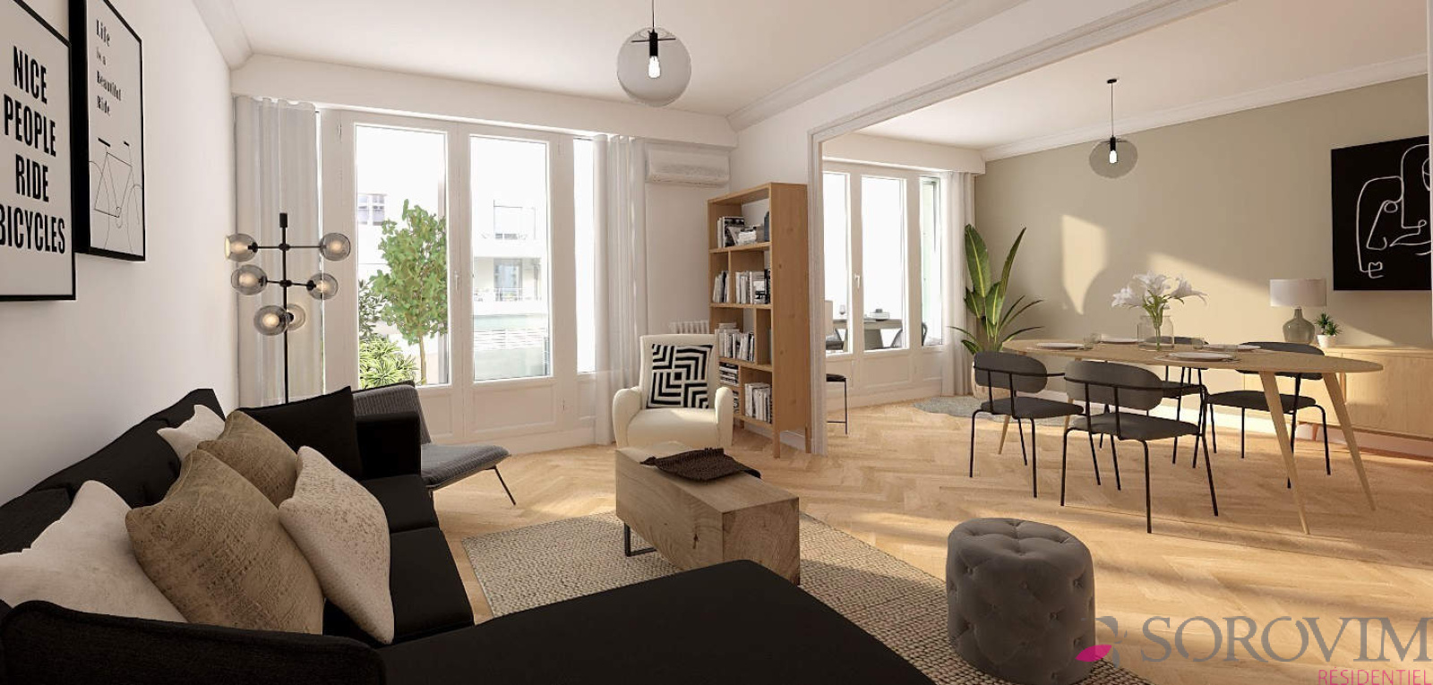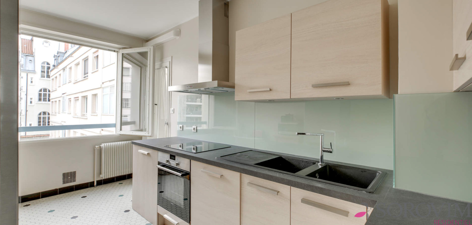 En exclusivité à Lyon 6ème proche place Puvis de Chavannes. Dans un immeuble Pitance sur son terrain, un appartement de 93 m² en étage élevé. Il se compose d'une entrée qui dessert un double séjour ouvert sur un balcon. Une cuisine équipée avec un coin repas ouverte sur une loggia. Deux belles chambres en parquet chêne donnant sur une cour au calme avec vue dégagée, une salle de bains.