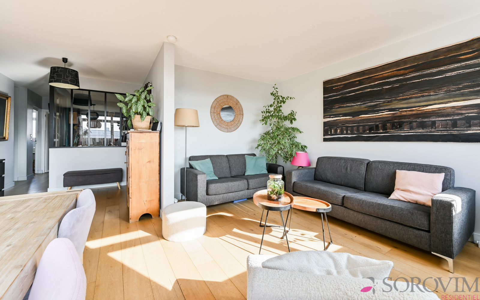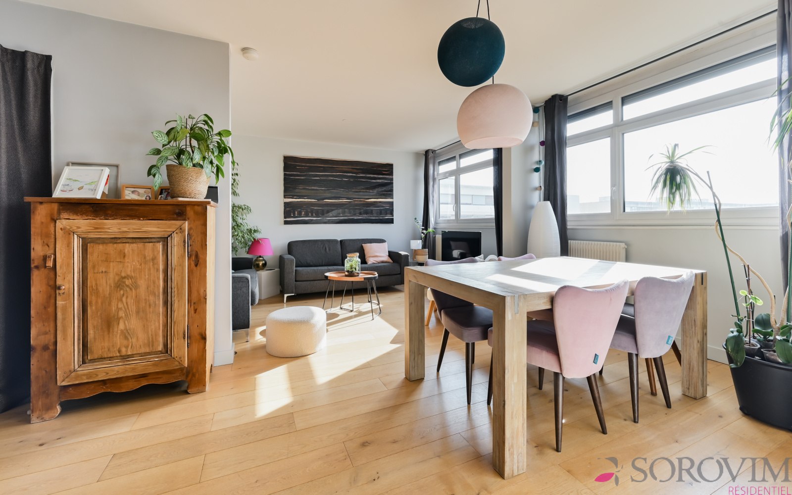 Lyon 3 - A proximité de la Gare de la Part-Dieu. Dans un immeuble des années 70, en étage élevé, vous serez séduit par cet appartement lumineux, traversant Sud & Nord et entièrement rénové avec goût. Il est composé d'un hall d'entrée accueillant un séjour avec salle à manger et cuisine contemporaine ouverte sur une loggia de 5 m² exposée plein Sud. La partie nuit offre trois chambres, une salle de bains moderne et un toilette indépendant. Il allie une rénovation soignée avec matériaux de qualité aux prestations contemporaines. La création d'une verrière pour l'espace bureau apporte de la modernité. Porte blindée, double vitrage, stores manuels et électriques dans les chambres, aménagement dressing. Cave. Possibilité garage en sus pour 20 000 €. Proche toutes commodités, métro Part-Dieu et C3 cours Lafayette.