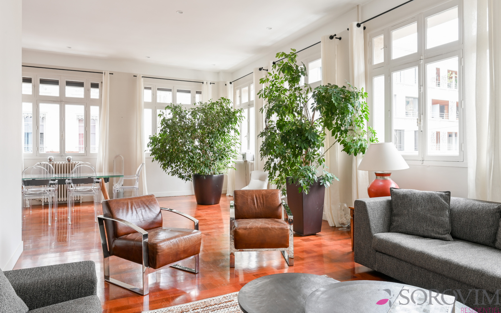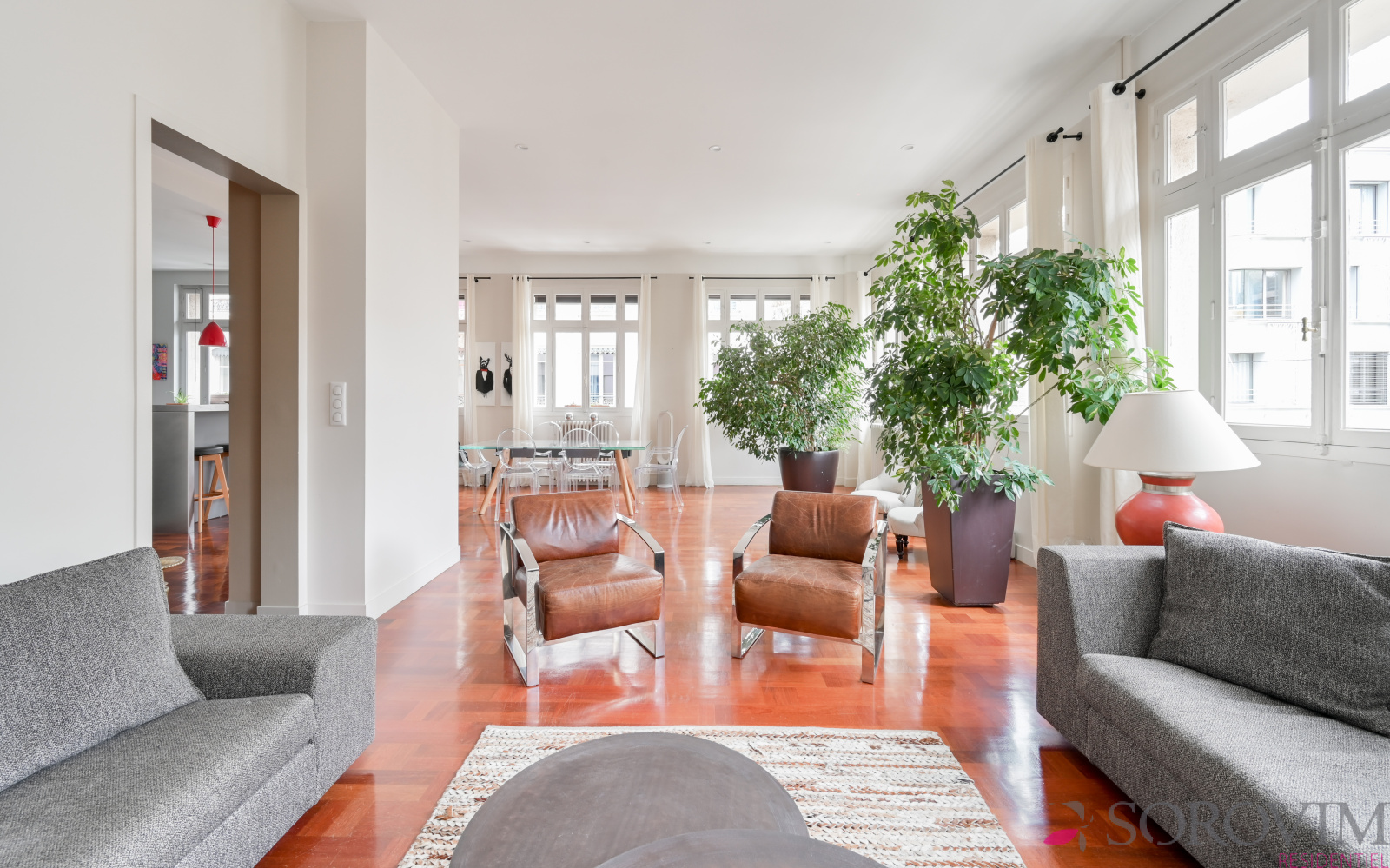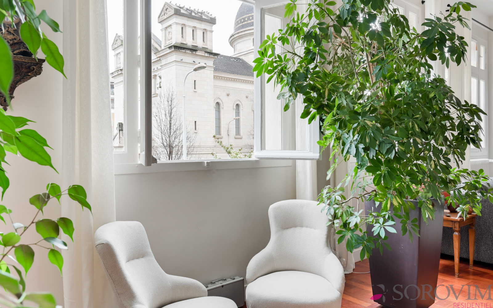 Lyon 6ème Saint Pothin - Dans un bel immeuble Art Déco, vous serez séduit par cet appartement bénéficiant d'une magnifique vue dégagée sur l'église Sainte-Croix. Cet appartement familial de 241 m² offre un espace de réception en angle comprenant une grande entrée, un salon, une salle à manger et une cuisine ouverte équipée. La partie nuit bien distincte ouvre sur un espace salon télé pouvant faire office de bureau. Six chambres dont la suite parentale avec dressing et salle de bains. Une salle d'eau, une buanderie et un atelier complètent cet appartement d'exception.