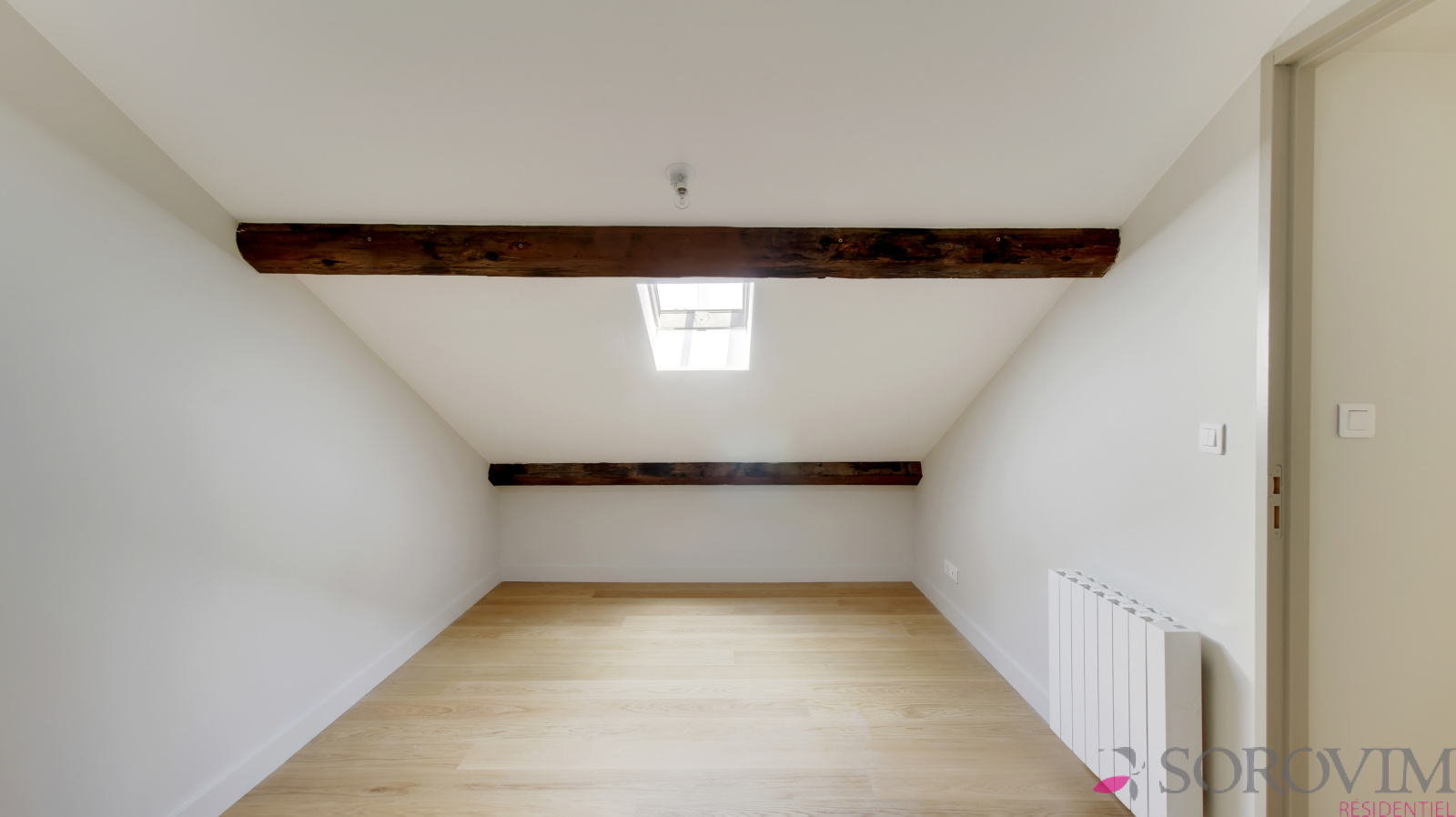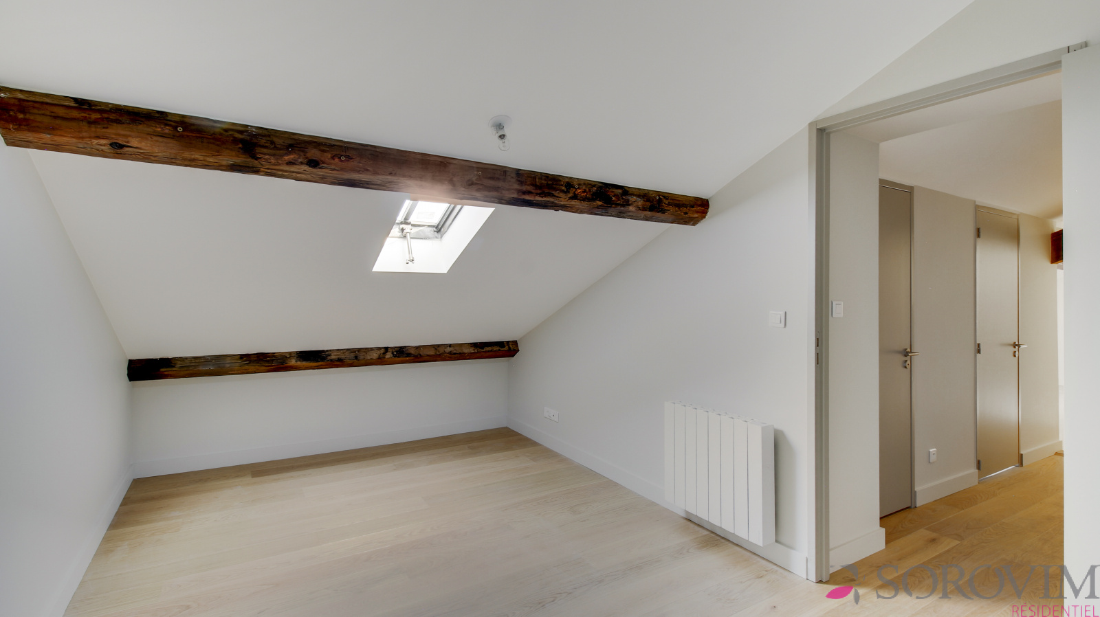 LYON 2ème, face à l'église Sainte-Blandine. Dans un immeuble ancien, au dernier étage avec une vue dégagée, beau duplex entièrement rénové de 103 m² habitables dont 77 m² Carrez. Il se compose sur la partie inférieure d'une pièce de vie de 45 m² avec parquet et cheminée, traversant Est / Ouest et d'une cuisine ouverte. Une chambre parent avec sa salle d'eau et wc indépendant complètent ce niveau. A l'étage, des combles aménagées avec poutres apparentes offrent une belle chambre en sous-pente avec velux, un espace bureau et une salle de bains avec lumière naturelle et un wc. Chauffage individuel. Cave.
