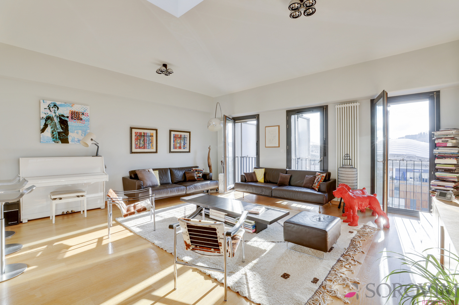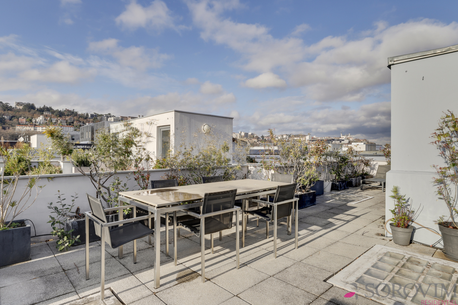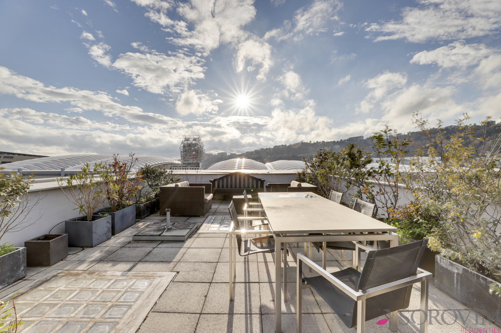 En dernier étage d'une résidence contemporaine de standing, bel appartement familial en duplex de 140 m² bénéficiant d'un toit terrasse avec une vue dégagée. La pièce de vie de 50 m², exposée plein Sud, offre un beau volume avec 3 m de hauteur sous plafond et une cuisine équipée haut de gamme. L'espace parents est composé d'une chambre en parquet avec des dressings réalisés sur-mesure, une douche à l'italienne, une buanderie ainsi qu'un bureau. L'escalier permet d'accéder à la terrasse privative de 70 m² avec une vue panoramique sur Fourvière & la Saône. La partie inférieure du duplex est dédiée aux deux chambres enfants, une salle de bains avec douche et baignoire, un dressing.